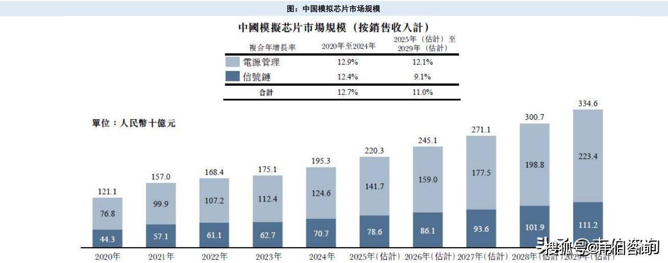 其中电源管理芯片由2020年的768亿元增长至2024年的1246亿元,信号链芯片由2020年的443亿元增长至2024年的707亿元。预计2029年中国模拟芯片市场规模将增长至3346亿元,2025-2029年CAGR为11.0%。
