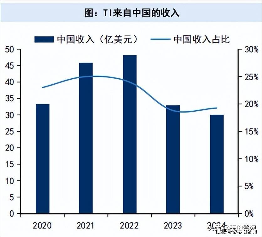 TI2024年来自中国的收入约30亿美元,同比减少9%,收入占比19%(按照终端客户的总部所在地统计)。