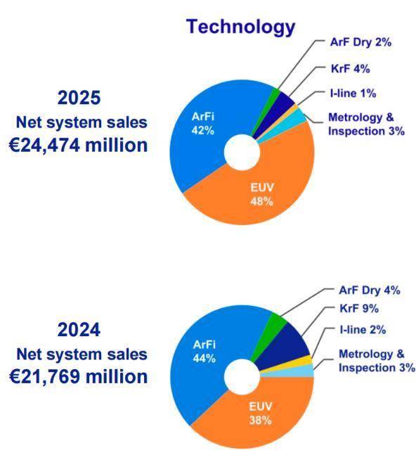 与此同时,一面是EUV 在收入结构中的占比持续上升,另一面来看,DUV 仍然是当前半导体制造体系中不可或缺的核心设备,具有可观的需求。当前业界绝大多数的光刻任务,依然由ArFi、ArF Dry、KrF、i-line等DUV光刻系统完成。ASML在财报的年度媒体发布会上也强调:DUV光刻机不仅现在是行业“主力”,未来仍将长期扮演“主力设备”角色。