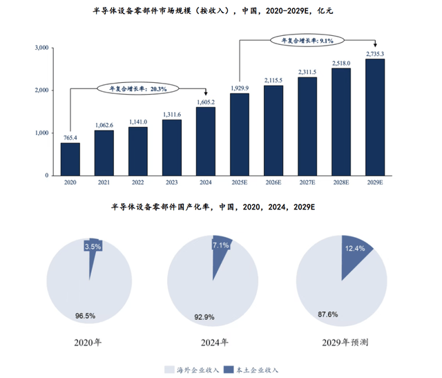 具体的数据如下,从市场规模来看,到2025年时,国内的零部件规模高达2000亿元左右,而在2024年时,国产化率仅7.1%,到2029年时也才12.4%,很明显在2025年时,是没有达到10%的。