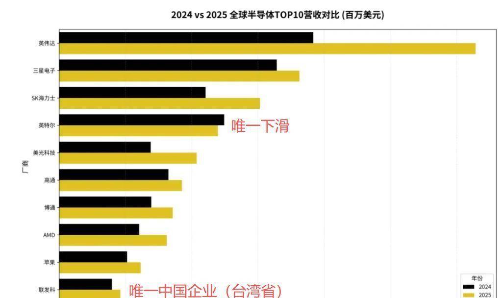 曾经不可一世的英特尔,营收同比下降了3.9%,只有479亿美元。 它的市场份额从2021年的12%,萎缩到了2025年的6%,刚好腰斩。 前十名里,除了英特尔,其他九家都在增长。